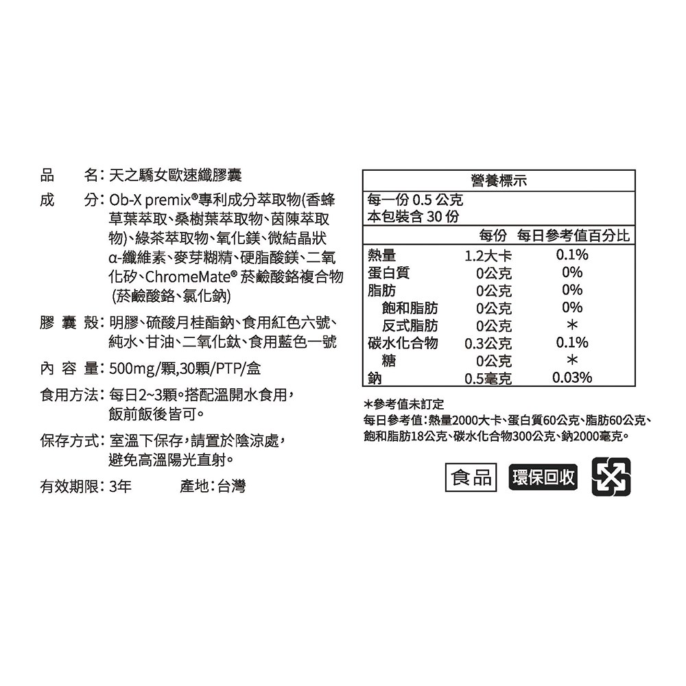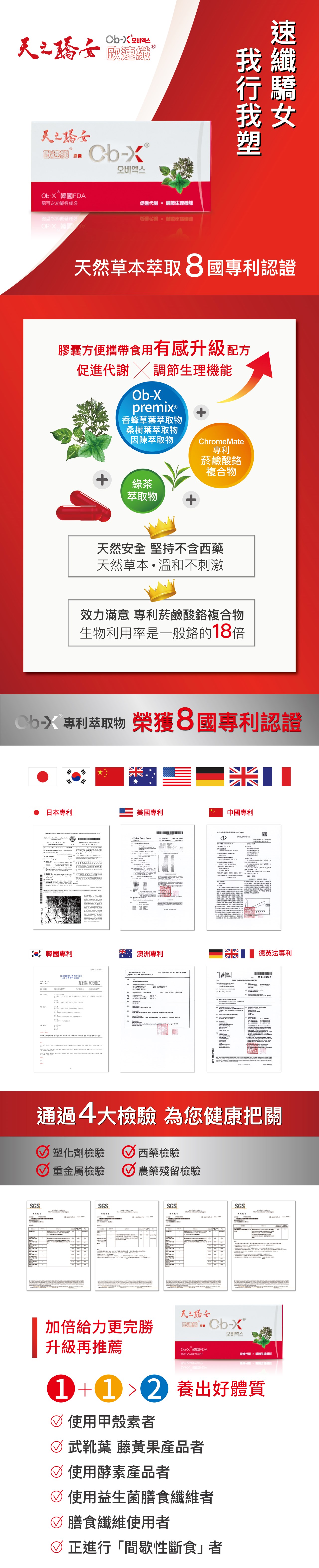 成分:Ob-X premix專利成分萃取物(香蜂草葉萃取、桑樹葉萃取物、茵陳萃取物小綠茶萃取物、氧化鎂、微結晶狀α-纖維素、麥芽糊精、